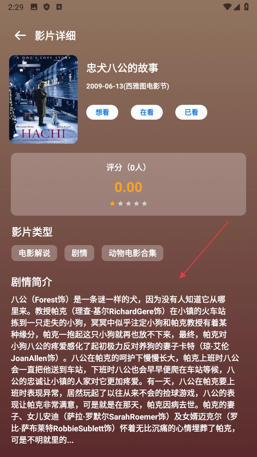 4、在电影的详细信息页面上,您可以查看相关信息,如评级、流派和情节摘要。