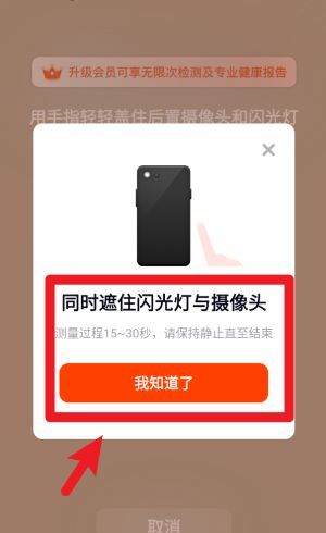 3、根据提示,用手指盖住相机和闪光灯,以确保系统能够正常获取心率信息。
