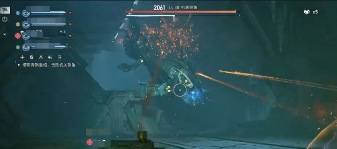 副本前期的精英怪难度相对比较低,可以迅速的清理。第一个boss就是机关铜鱼,没有属性弱点。需要靠场景炮击作战,炮击支持射击,还有开盾。全员进场之后就可以立刻启动无限子弹,可以持续的输出。这一个boss就有三大核心机制,例如扫尾就会触发地板伤害。选择闪避或者跳跃是没有作用的,必须要开启炮击,护盾抵抗。护盾只能够抵挡一次,激光出现之前集火触发之后就应该立刻离开,炮击,躲闪。等火焰消失之后,然后清理小怪,打败之后开启宝箱就能够领取紫色的装备。