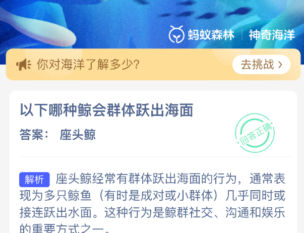 以下哪种鲸会群体跃出海面?【神奇海洋】2026年4月24日新题目已开答!正确答案现已公布,点击领取拼图,一起为修复海洋生态贡献力量!今日正确答案是:【座头鲸】。座头鲸经常有群体跃出海面的行为,通常表现为多只鲸鱼几乎同时或接连跃出水面。