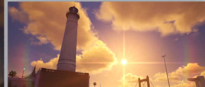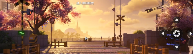 这里有一个关键操作:打开游戏内的时间系统,将当前时间调整为下午五点半左右。此时天空呈现黄昏时分的暖色调光影,正是拍摄落日的最佳时机。调整好时间后,使用相机功能将整个日落画面拍摄下来即可完成第一步。