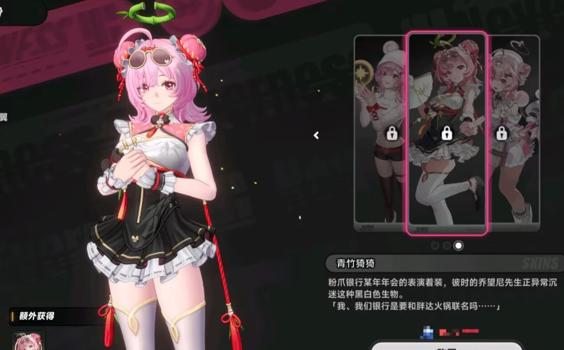 青竹猗猗作为比较火热的外观,它其实还有一段趣味性比较强的背景故事。由于他作为粉爪银行某届年会的表演时装,当时银行的乔望尼先生格外的沉迷。可爱的黑白色圆滚滚的生物,也正是因为这份喜欢,才有了小吱这套特别的年会造型。虽然说官方并没有直白的点名原型,但是众多的玩家在体验游戏的时候,往往一看就能够懂,毕竟这种看上去比较含蓄的设定,往往也能够让时装多了更多的趣味性。