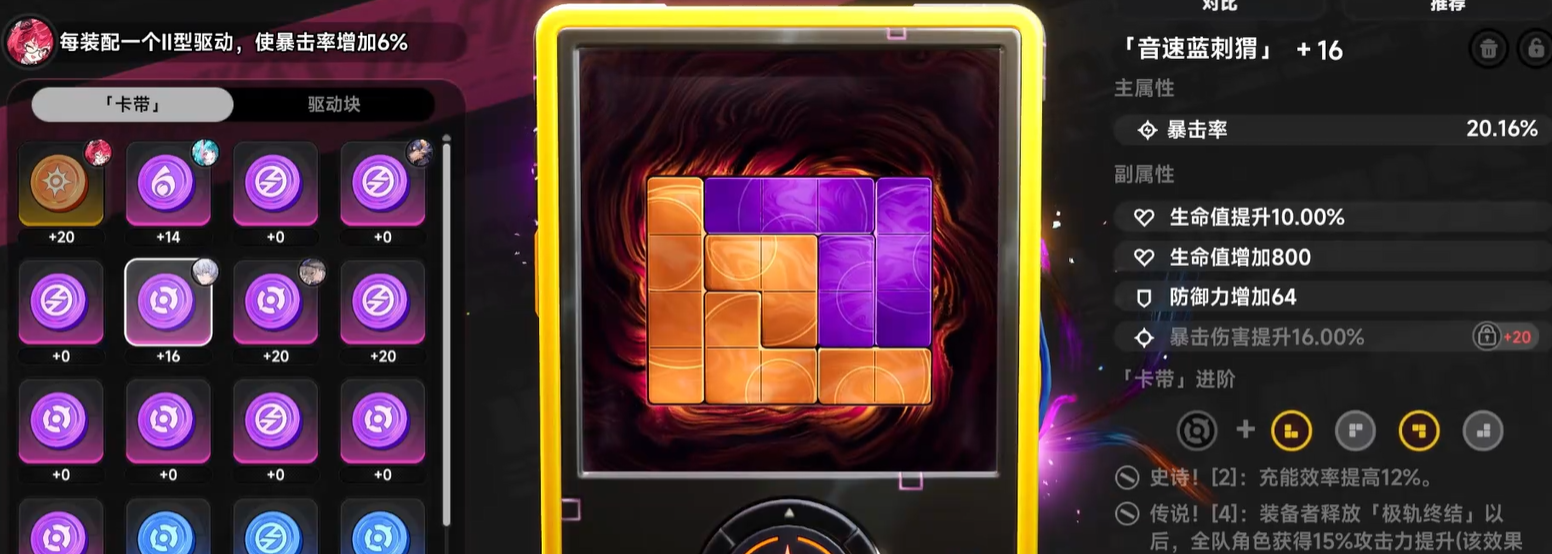空幕系统属于异环装备的又一大亮点。该系统由驱动块、卡带构成,卡带决定套装属性,驱动块为通用部件,可以扩充装备属性空间。选择卡带时先看双暴击+元素穿透的卡带是否符合自身需求,在确定角色技能等级的基础上再做选择。驱动块加到+5后才能解锁更多的槽位,从而给角色属性的扩充赋予更多可能,给角色成长和装备提升赋予更多的可能性。