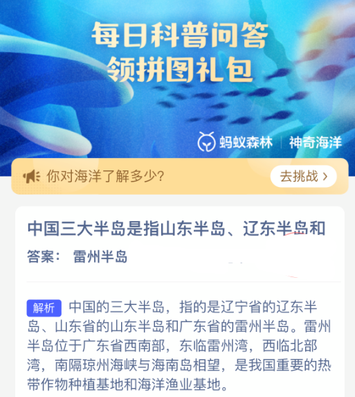 中国三大半岛是指山东半岛、辽东半岛和?【神奇海洋】2026年4月27日新题目已开答!正确答案现已公布,点击领取拼图,一起为修复海洋生态贡献力量!今日正确答案是:【雷州半岛】。中国的三大半岛,指的是辽宁省的辽东半岛、山东省的山东半岛和广东省的雷州半岛。