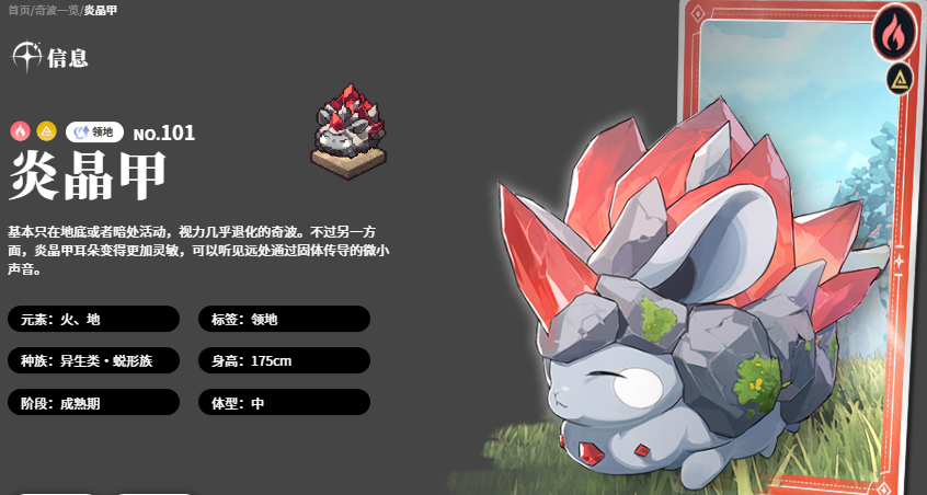 而最后一个同样是有双属性在身的角色,叫做炎晶甲,炎晶甲身上有火元素功能的同时也有地属性的效果,在这里通过自身的技能可以对敌人抛出更多的巨大石块,而周身在进行攻击的情况下,他抛掷出去的各种输出方式除了石块之外,还有岩晶碎片,通过岩晶暴击这个技能,同时向周身可以抛出去12枚岩晶碎片,每一面的碎片都可以对爆炸范围之内的敌人造成75%左右的火属性伤害,并且此时给全队的角色附加的减伤效果也比较多,持续15秒的减伤可以让我方在操作当中有更多的角色搭配能力。