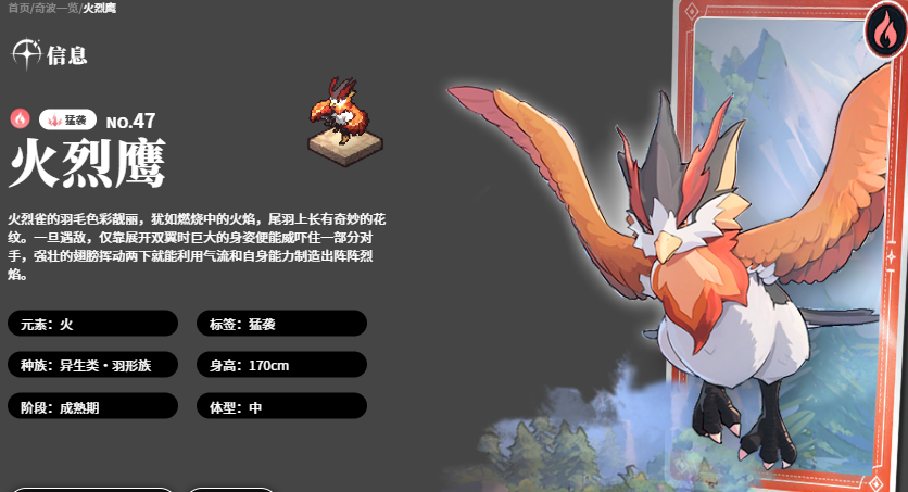 如果是喜欢玩儿火元素当中的奇波,建议大家选择的是火烈鹰,火烈鹰在自己猛袭的标签当中带来的功能是非常强的,这里可以通过烈火龙卷这类技能,对敌人造成大型的火焰龙卷风,每一次都可以造成110%左右的火属性伤害,这个技能还可以快速向前穿越整体战场,因为它有飞行的功能,对飞行路径当中的敌人每一个都可以造成359%左右的攻击能力,而且此时只要是火烈鹰以及搭配角色放在一起用的话,所有角色的攻击能力都会有百分比的提升,在这里火烈鹰给火属性其他角色带来的提升效果都是非常强势的。
