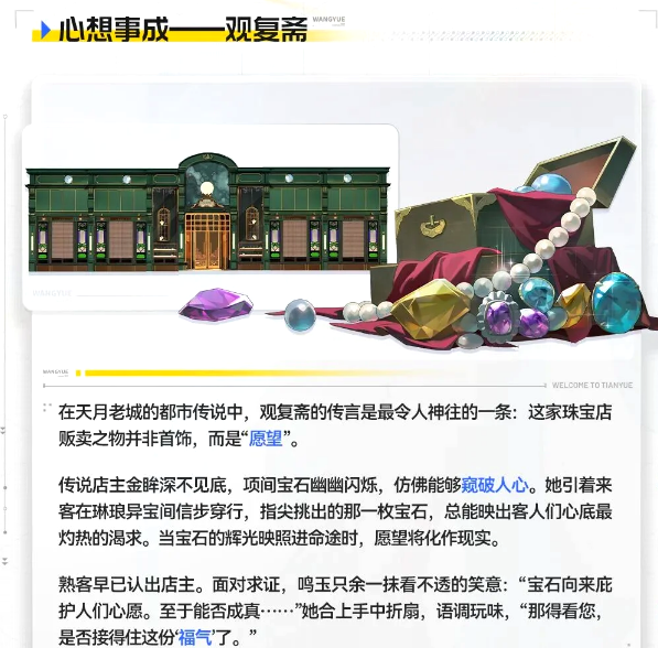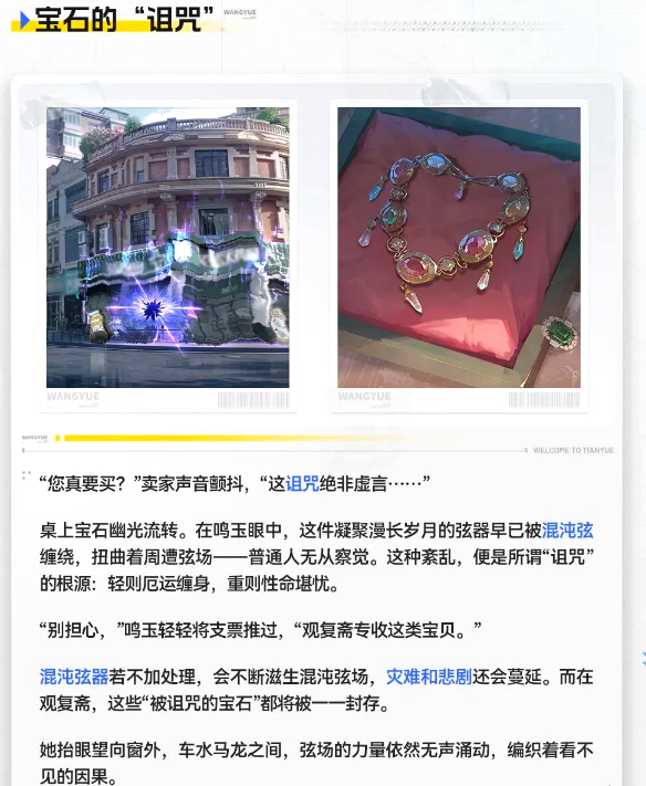 作为观复斋的老老板娘鸣玉拥有神奇的力量,能够听到来到他店里面顾客的心愿,将顾客的愿望与情感转化为真实的祝福,再通过珠宝的方式传递给客户,所以才拥有了能够实现愿望的传言。净化和守护也是核心之一,能够将被污染或者诅咒的宝石进行净化,与人们隔绝来保护整个都市的安全。