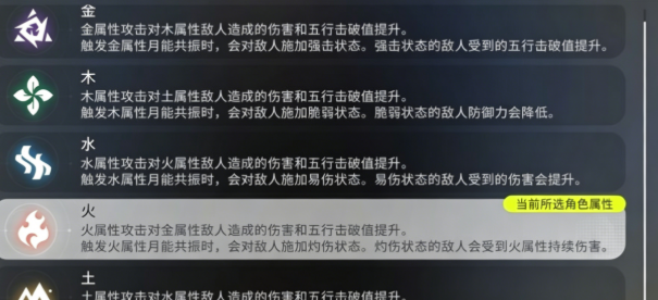 木属性的敌人进行攻击的话,伤害会提升,并且会给被攻击状态态附加一个强击状态。这里需要注意的是,挂buff的状态是跟月灵共同完成的,所以月灵的属性一定要和觉醒者的属性是一样的才能够主动去施加状态。木克土,土克水,水克火,火克金,这个就是属性之间的克制关系,被克制的那一方所受到的伤害会增加。