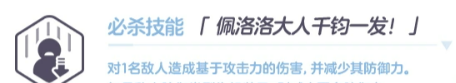 必杀技能「佩洛洛大人干钧一发!」针对单体,对一名敌人造成伤害,同时降低对方的防御力。遇到轻装甲类型的敌人,防御力削减的幅度会更大。这个技能单看伤害,可能不算特别亮眼,但它给队友创造了更好的输出条件。对方防御低了,队里的输出角色,自然能打出更高的数字。