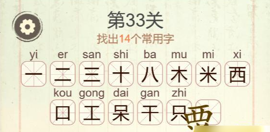 1、第33关粟找出14个常用字.拆分时,上部“西”可取出“一”“二”“三”“十”“八”“口”“工”;