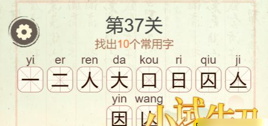 《聪明开局吧》第37关要求从“因”字中找出10个常用字,答案为一、二、人、大、口、日、囚、亼、因、亾。可按外框到内部、由简到繁的顺序细心拆解,即可顺利通关。