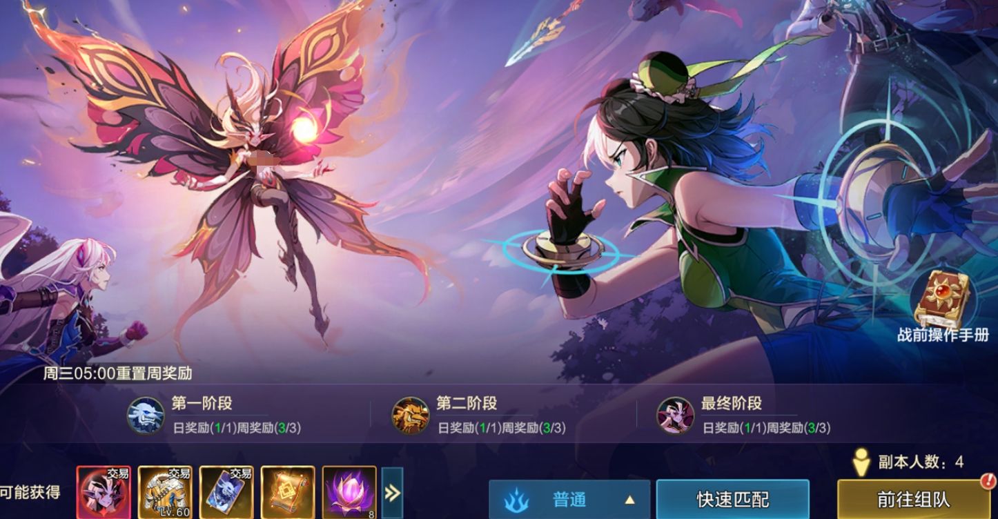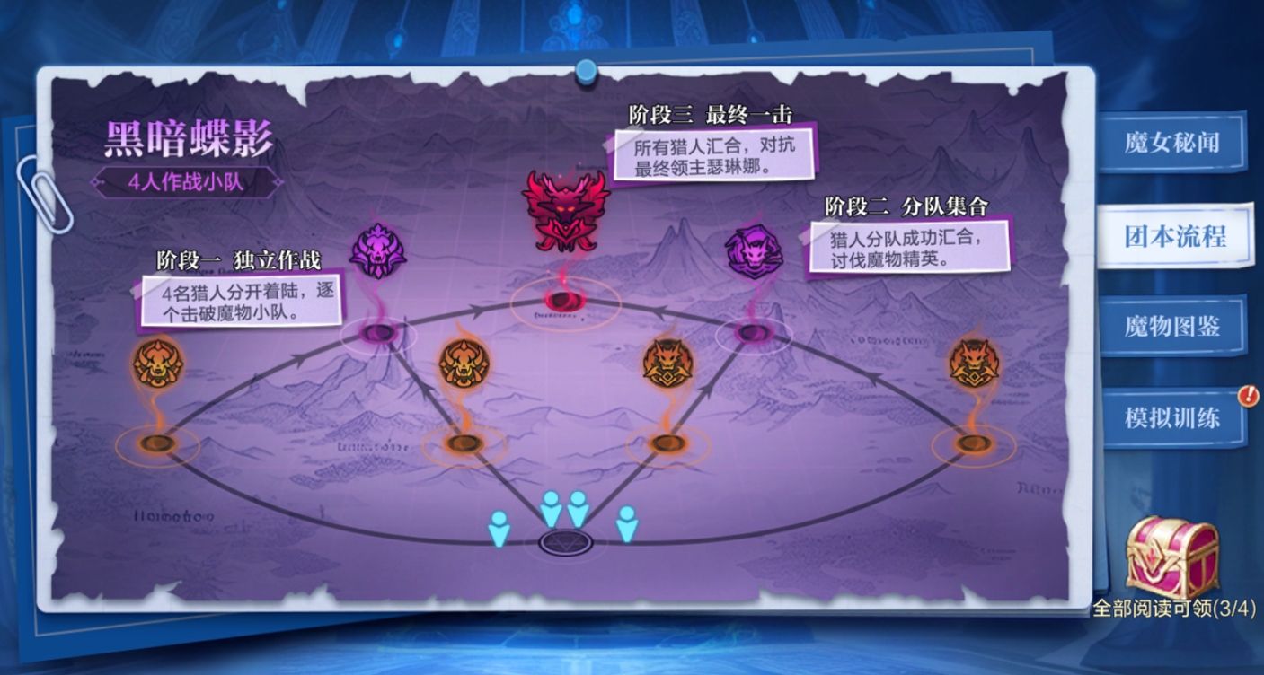 需四人共同挑战的黑暗蝶影团本共分为三个阶段,玩家们在第一阶段时需独立作战,击败各节点里的所有敌人,该节点里的敌人都比较容易对付,且没有特殊的招式,只要玩家多利用闪避来躲开敌人的攻击,不被敌人击中太多次,那么在第一阶段就基本上没有任何的性命之忧,可轻松通过。等所有人都将第一阶段的小怪解决完后,便能集合到一起开启第二阶段对精英敌人的挑战。