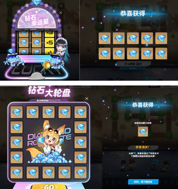 3、额外福利:通关钻石矿场对应前置关卡,可解锁钻石幸运星、钻石大轮盘,参与可获得丰厚钻石奖励,进一步提升收益。