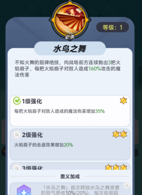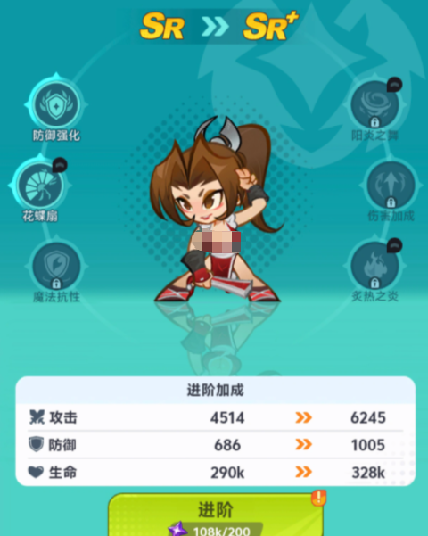 角色等级得到提升之后,天赋技能也会有额外的提升,花蝶扇作为游戏里的战技,每次释放技能都有40%的几率,抛出一把带有烈焰的扇子,烈焰会给对手带来300%的攻击伤害,对战过程中角色利用魔法抗性,可以增加自身10%的生命力,等级达到SSR级别之后,会在游戏里拥有阳炎之舞特技,每隔一段时间都会召唤火焰随机攻击一名对手,火焰会对对方带来300%的魔法攻击伤害,附带1秒钟的眩晕效果。