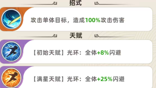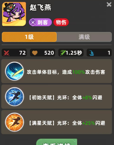 另外在天赋效果当中,赵飞燕可以通过自己的初始天赋带来光环的加成,这里的光环是给全体的角色带来8%的闪避,而且这里闪避有一个比较大的优势,就是不挑队员,不管队伍当中大家拿到的是全刺客阵容,还是有其他类型职业的英雄在其中,都可以享受到这里带来的8%闪避,这一点跟其他职业流派带来的加成效果就不太一样,因为有一些英雄的增强能力只是针对于同职业的其他英雄进行增强,而这里赵飞燕是给全局的队友都带来8%闪避的加成效果,而达到满星的情况下,这个天赋光环带来的是全体都有25%的闪避功能,所以赵飞燕在有满星天赋给队友带来加成的情况下,我方是可以避免受到对面更多攻击能力的。