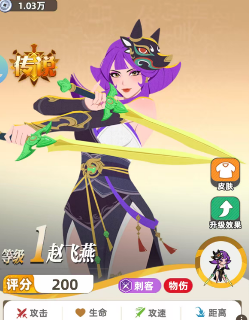 游戏当中的赵飞燕其实是属于一个传说品质的英雄,所以在自身的基础能力当中评分没有红色英雄评分那么高,但是她作为一个前期比较适用的刺客角色,能够带来的物伤还是有不错的升级效果可以使用,想要让她的能力得到最大化的发挥,建议大家就要把她放在刺客队里面,这样才可以提升她更多的功能效果,目前在自身的攻击效果当中,一般是对单体的英雄进行输出,这里在招式效果当中没有什么附加的功能,就是基础的百分百攻击。