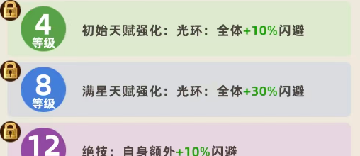 另外在8级的情况下,也就是她满星的天赋也会得到强化,那么此时带来的光环功能是,会对成员都带来30%左右的闪避加成,所以在这个等级带来的闪避加成会比之前更高一些,另外还会附加各种属性提升的百分比,一般情况下其实她到4星就足够使用了,如果是想要更多闪避加成的话,可以把她提升到12级,此时可以额外增加10%闪避叠加在之前的增强效果当中,因为她自身目前其实效果比较单一,只能给我方的角色增加闪避功能,其他的输出效果是比较一般的,所以如果是主流核心阵容当中已经有了足够输出的刺客类型角色,之后需要此类辅助角色的话,大家就可以选择赵飞燕上场,因为她目前自身的天赋功能只能支撑队伍当中需要的闪避增强概率,其他的方面他没有什么能力可以让大家跟队伍里面的成员进行配合。