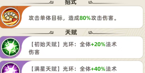 后期通过天赋功能,可以在这里给大家带来的光环加成是全体增加20%的法术伤害,所以目前通过这个百分比加成,大家也只能把他当做谋士队里面的辅助使用,当然大家如果是在搭配成员的时候,有空余的位置才可以放张梁,毕竟他这里的效果也是非常单一的20%的法术加成,给我方谋士队带来的增强效果还可以,其他队伍就不行了,特别是后期达到满星天赋以后,张梁可以给全体的成员都带来40%的法术加成,当然如果队伍里面大家模式用的多,更需要法术加成的情况下,这里满星的情况才会好用一些,如果队伍当中大家用的谋士角色比较少的情况下,这个技能天赋可能就没有什么用了,所以如果是玩谋士队,且大家核心的成员都已经组成的情况下,在空白的位置上面加一个张梁,作为增益加强使用还可以。