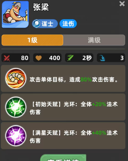 那么今天为大家推荐的也是一个蓝色品质里面强度还可以的英雄,叫做张梁,张梁在游戏当中定位效果还是比较清晰的,目前在谋士队里面,张梁也是可以跟很多的成员放在一起,使用他的评分根据蓝色品质的优秀英雄,只能得到100的评分,但是张梁造成的谋士伤害距离还是可以的,在3格之内可以对敌人进行各种法伤,而且他攻速也是有两秒的,虽然这个攻速相对于其他红色品质的英雄来说是比较慢,但是在蓝色品质的英雄里面,这个攻速已经算是相当不错的了,另外招式效果当中也是一个普普通通的攻击,而且造成的攻击伤害并不是100%,基础的80%,只能选择一个单体敌人进行输出。