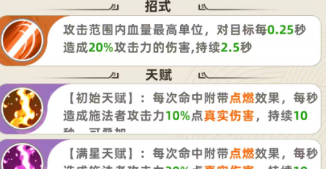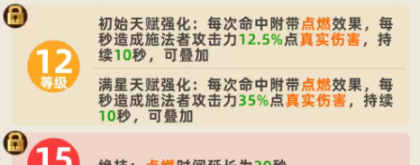 所以建议如果前期要用周瑜的话,至少是要把他提升到9级,这样他在强度上面才可以搭配更多的成员,另外,在等级提升到12级的情况下,就是天赋得到强化,初始的天赋得到强化的话,这里带到点燃效果当中,每一秒造成的攻击能力是周瑜身上攻击数值当中12.5%的真实伤害,同样持续10秒的时间,大家可以快速的叠加起来,如果是满星的情况下,这个比例会更高一些,造成的是周瑜身上35%左右的点燃伤害,点燃伤害当中基本带来的都是真实类型的伤害效果,然后他的等级提升到15级以后,进行绝技输出,点燃的时间就会延长为30秒了,那么在长达半分钟的输出效果当中,周瑜的点燃对于敌人而言,就是持续输出的功能效果,跟他的基础技能放在一起使用的话,可以带来的天赋加成也比较多,所以如果用周瑜的话,他带来的各种持续性功能都比较多的情况下,谋士队里面他能够保证阵容里面的整体输出。