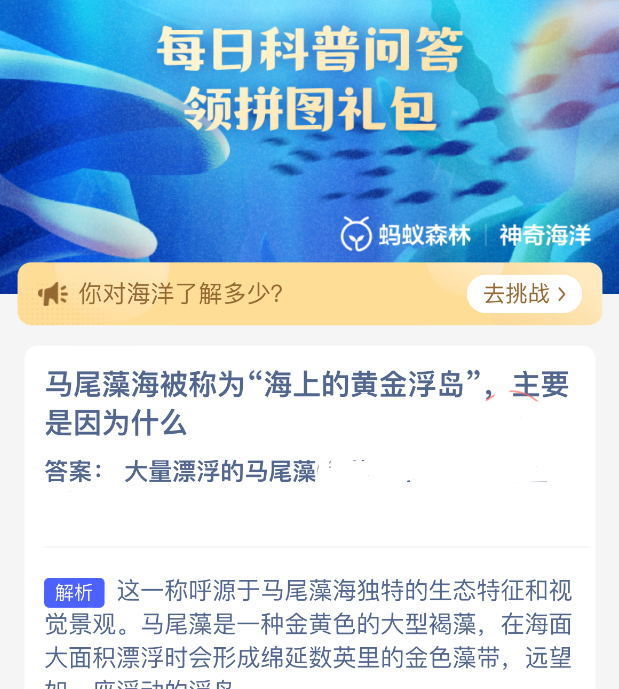 马尾藻海被称为“海上的黄金浮岛”,主要是因为什么?【神奇海洋】2026年4月29日新题目已开答!正确答案现已公布,点击领取拼图,一起为修复海洋生态贡献力量!今日正确答案是:【大量漂浮的马尾藻】。马尾藻海被称为“海上的黄金浮岛”,主要是因为大量漂浮的马尾藻。