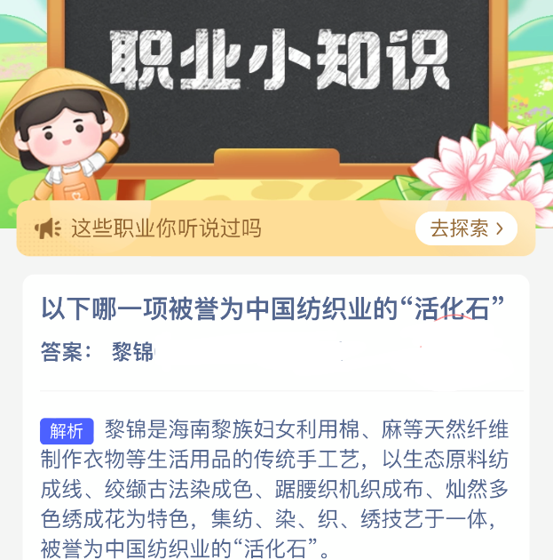 以下哪一项被誉为中国纺织业的“活化石”?【蚂蚁新村每日一题】2026年4月29日题目新鲜上线啦!今日答案是:【黎锦】。每日坚持答题,不仅能积累木兰币为小镇建设添砖加瓦,更有惊喜奖励等你来拿。只要答对今日题目,即可立即享受“产速+3/时”的加速福利,让你建设小镇的步伐更快一步。