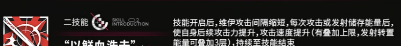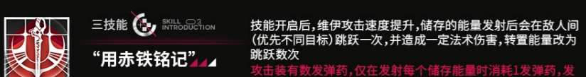 三技能「用赤铁铭记」是弹药技能,共27发弹药,攻速提升幅度很大,推测加200,差不多1秒一个球。攒的普通球发射后,会在敌人之间跳跃一次,转置能量则会跳跃更多次,推测大概弹5次。发射一个储存能量,消耗1发弹药,发射转置能量消耗3发。演示场景是伦蒂尼姆城防自行炮和萨卡兹战士,综合算下来,对群大概10万出头,但对单弹射的话,应该能到15万以上,具体数字,因为演示敌人血量太少,还不太好完全确认。