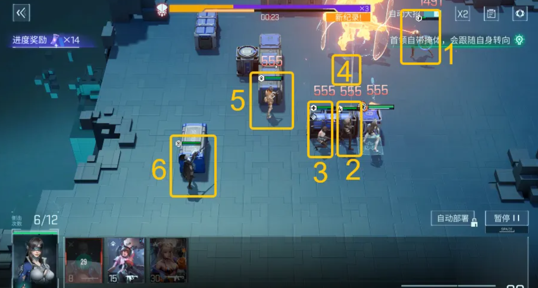 打这个 BOSS 别傻乎乎的硬莽,它总共会换 5 个区域乱跑,你要是追着它打,那纯属浪费输出。不少人之前就是没注意破弱点,打了半天 BOSS 血条动都不动,还以为是自己输出不够,疯狂堆输出,结果没用,这 BOSS 的弱点不破的话,防御高得离谱,你输出再高也刮痧。起手先在中间放突击位的赫尔达,上方丢工程位格拉苏,先破掉 BOSS 第一层弱点,这时候 BOSS 的防御会掉一大截。接着赶紧去右上位置上火力位希・西雅,把第二层弱点也破了,这时候 BOSS 直接就瘫痪了,趁这个功夫赶紧清左下方的小兵,别让小兵偷你后排。清完小兵就等部署费用,等 BOSS 醒了要换区的时候,提前在它要去的位置摆好单位,别等它跑过去你才动,那时候就晚了,这么一套下来,BOSS 根本没机会放技能就没了。
