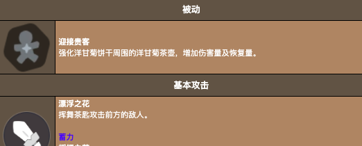 基本攻击为“漂浮之花”和“摇摆之花”,通过漂浮之花蓄力和激发摇摆之花,漂浮之花通过挥动手中茶池可攻击前方敌人,而摇摆之花同样是这种攻击模式,但其可对前方敌人的伤害数值进行额外增加。