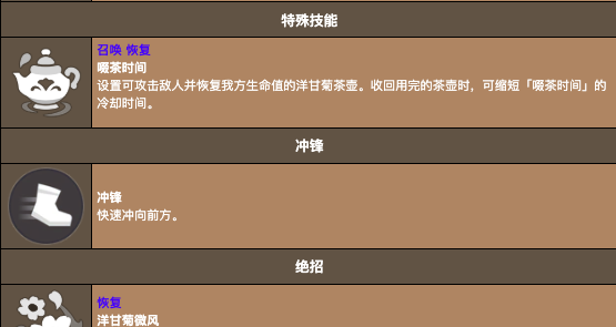 特殊技能为“啜茶时间”,对可攻击敌人可进行自由设置,并完成己方生命值的恢复,在收回用完的茶壶时,则可缩短“啜茶时间”的冷却时间。