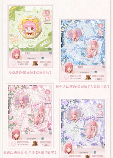 更新之后登录游戏,系统会直接送一个叫"草莓契约"的星光墙给玩家。这个是免费的,不用花钱就能拿到。如果想要更多样式的话,可以参加累充活动。充值经验累计到2880的时候,能解锁三款不同风格的星光墙,分别是"粉缎诗礼赞""人鱼诗礼歌"还有"薰紫诗礼颂"。这几款星光墙的配色和图案,都不太一样,可以按自己喜欢的风格来选。