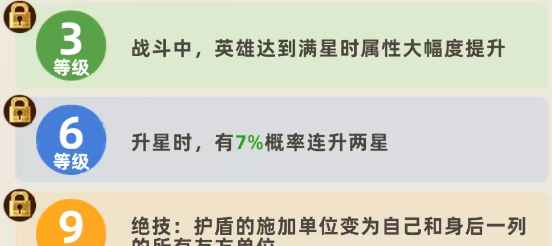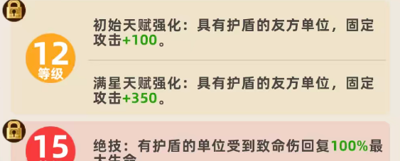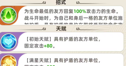 另外根据这样的效果就可以发现,他在利用技能的时候是可以在己方距离5个格子之内都给友方单位施加此类护盾效果的,不过其中的限制就是只能在他身后1格的友方单位上面施加护盾,所以这里站位大家调整的时候要看自己身后是谁,另外在天赋功能上面,他可以带来的初始天赋,是给具有护盾效果保护的友方单位带来固定攻击上面80点的加成,如果天赋能力达到满星的情况下,这里具有护盾的友方单位,他在固定的固定的攻击数值上面是会有280点的加成效果,所以满星带来的这个加成数值还是要高一点的。